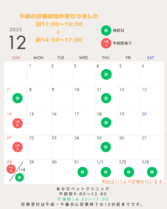 地域の皆様の かかりつけ動物病院 お知らせ クリニック紹介 診療案内 トリミング アクセス メニュー お知らせ クリニック紹介 診療案内 トリミング アクセス \当日の予約はお電話にて/ 0744-46-5367 インターネット予約 ※ 予約について ・予約優先とはなりますが、予約ができなかった場合でも、窓口に直接お越しいただきましたら診察をさせていただきます。・午前のみ予約診療を受け付けております。・初診の方は予約ではなく、直接ご来院ください。 診療時間変更のお知らせ 2025年10月1日より、午後の診察時間が変わります。午前の診察時間は変わりありません。 旧:17:00~19:30 新:14:30~17:00 診察時間 ・初診の方は、問診やお話をお伺いするのにお時間を要するため、診療終了時間の30分前までにお越しいただくようお願い致します。・午前午後共に、受付終了間際は混雑することが多くなりますのでご了承ください。 お支払いは現金のみとなっております。 窓口精算可能な保険:アイペット、アニコム 診療案内 病院からのお願い ワンちゃんは首輪又はハーネスにリードを付けてご来院下さい。ネコちゃんは洗濯ネットに入れてからキャリーバッグに入れてご来院下さい。特に怖がりな子はバスタオルをかけてあげると安心します。 詳しく見る お知らせ 12月診療カレンダー 12/31〜1/4休診となります。 年末のお薬・処方食のご注文はお早めにお願いいたします。 初診の方は診察終了時刻の30分前までに受付をお願いいたします。 臨時休診のお知らせ 本日11月19日(水)の午後の診察は休診とさせていただきます。 午前の診察は通常通り行います。 急なお知らせとなり、大変申し訳ございません。 ご迷惑をおかけ致しますが、何卒ご理解の程よろしくお願いいたします。 臨時休診のお知らせ 12月7日(日)は臨時休診となります。 予めご了承ください。 詳しく見る 当院は1993年の開業から 「誠実な診療」を心がけてまいりました。 知識・技術を磨き、飼い主様と大切なご家族に最善の医療を提供できるようにこれからもスタッフー同全力を尽くして参ります。 病気やケガの時だけでなく、散歩の途中に耳掃除や爪切り、体重測定などでもお気兼ねなくご来院ください。 おかだペットクリニック院長岡田 直樹 トリミング 当院では患者様を対象にトリミングを行っております。獣医師による聴診・触診・体重測定の後、お預かりとなります。 通常のシャンプーコース・カットコースに加え、皮膚にトラブルを抱えたわんちゃんにおすすめしている薬浴コースもございます。 体調に異変があればすぐに処置をし、病気や怪我の早期発見に努めます。 トリミング アクセス 〒633-0011 奈良県桜井市三輪45-4 ・JR/近鉄桜井駅より徒歩約16分・JR三輪駅より徒歩約11分・お車でお越しの方は専用駐車場がございます アクセス